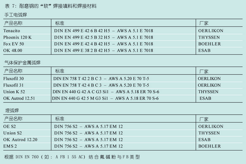 表7所示为适合于“软”焊接填料的综述。在任何情况下,根部焊缝应进行“软”焊接,这样就可把焊接所产生的张应力全部吸收。