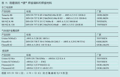 对极易磨损的焊接部位而言,我们推荐面层焊道,应釆用专门的耐磨堆焊焊条来焊接。关于该焊条的应用,表8列出了适合于“硬”焊接填料的综述。但必须考虑的是,焊接时随着硬度增加冷裂风险也会增加。