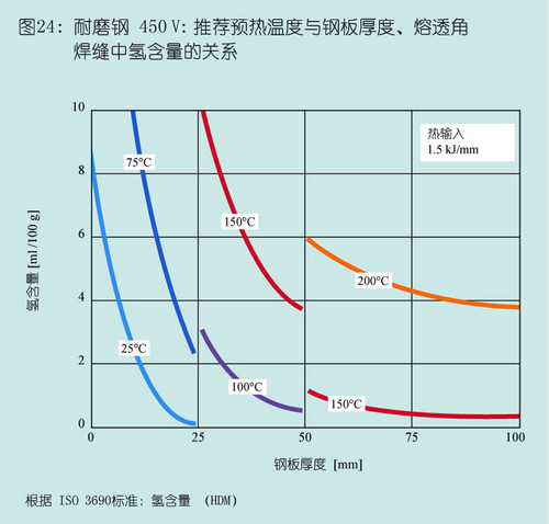 图23—图25显示了耐磨钢焊接时的预热温度。同时图23—图24也显示了推荐的最小预热温度与钢板厚度、碳当量(CET)及熔融焊接填料中氢含量之间的关系。
